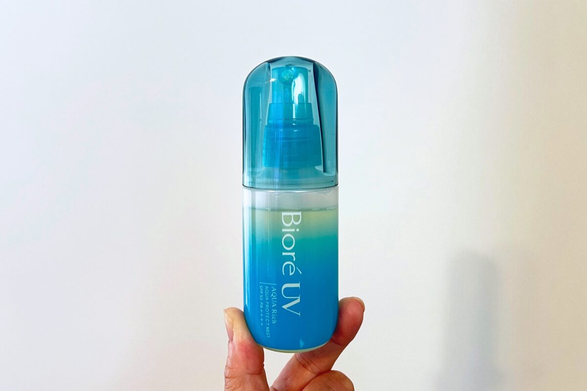 先程ご紹介したビオレUVアクアリッチシリーズのミストタイプの日焼け止めです。霧状のミストが肌にのるとジェル状に変化してぴたっと密着する処方で、透明な液体ながらSPF50 / PA++++ としっかりUVカット効果があるのはさすがの一言です。上下逆さまでも噴霧できるボトルだから、首の後ろや背中など手が届きにくいところにも塗布しやすい!何よりミストタイプなので、鏡がない屋外などでも白残りを気にせず塗り直し・塗り足しできてとても便利です。先日、子どもの運動会に持参してそのよさを実感しました。髪の毛に使えるのもミストタイプならではのうれしいポイントです。