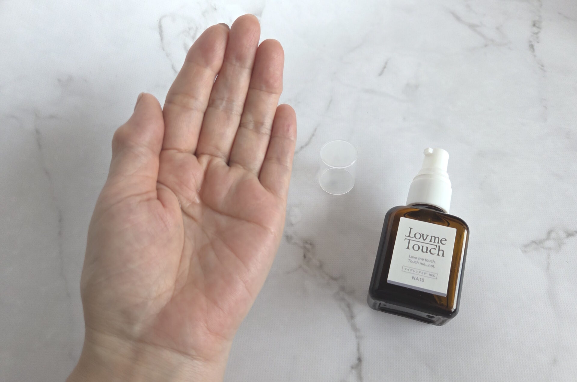 そんなナイアシンアミドを10%配合した美容液が、「ラブミータッチ NA10」。化粧水のようにさらっと軽やかな使い心地で、暑い季節でもストレスなく使えます。香りはほとんどなく、香料が苦手な方にも◎。ただし、ナイアシンアミドは肌質によっては乾燥を感じることもあるため、使用後は乳液やクリームでしっかり保湿しましょう。