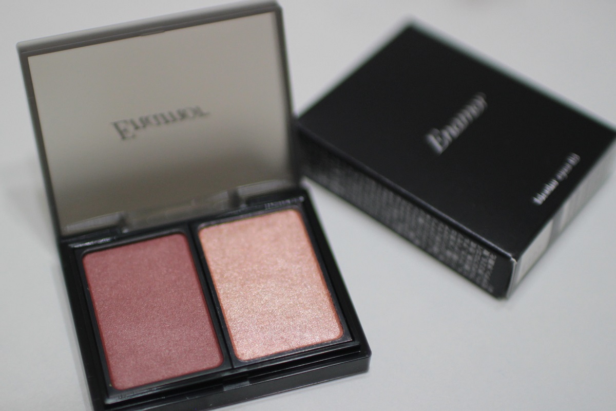 血色感があり、秋に使いたくなるアイシャドウ。赤みが強く、上級者向けに感じるかもしれませんが、左の濃いマット→右のパールの順でぼかすようにのせるとまぶたになじみます。2色で簡単にハイセンスな大人っぽい目元に仕上がり、時短にも!しっとりとした粉質で、色持ちもよいです。