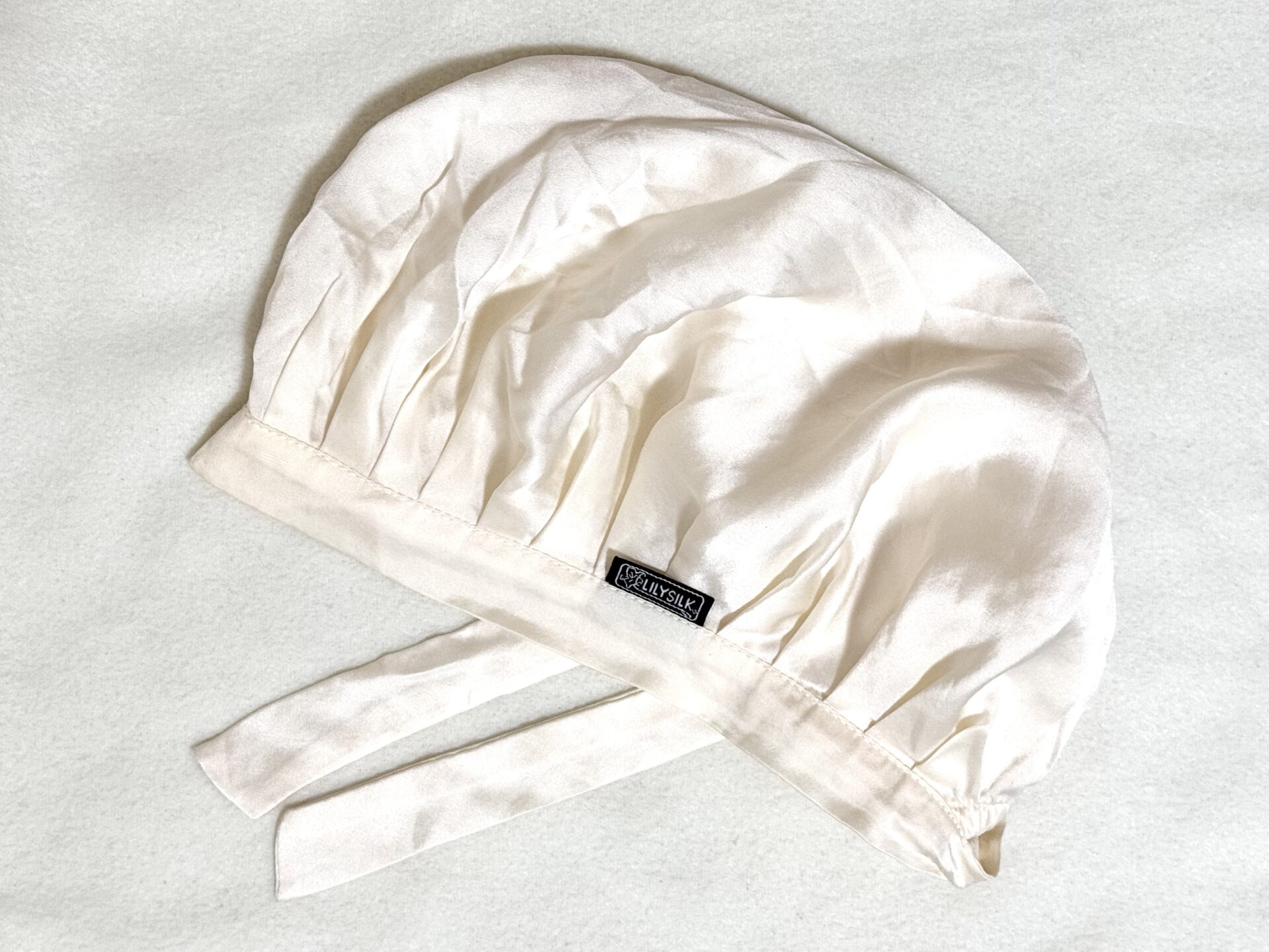 「リリーシルク 天然シルク100% ノンマークナイトキャップ」は、天然シルクのみでつくられ、軽さと通気性のよさが魅力です。後頭部のリボンで締め付け具合を調整できるため、朝まで着用しても額にゴムの跡がつくことはありません。