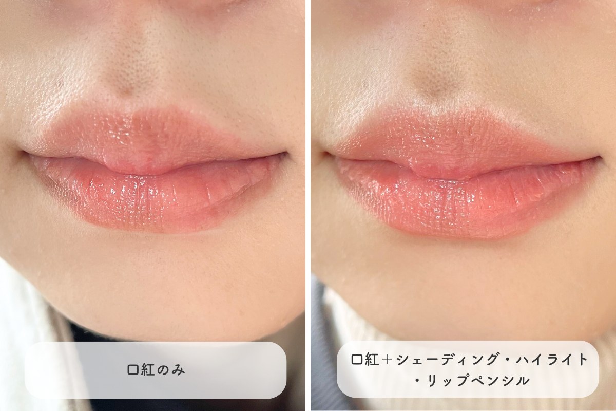 まずは、リップメイクの仕上がりの違いを比べてみましょう。左は口紅のみ、右は口紅のほかにシェーディング・ハイライト・リップペンシルをプラスした仕上がりです。口紅単体よりも、アイテムを足した方がぷっくりと印象的な唇に。