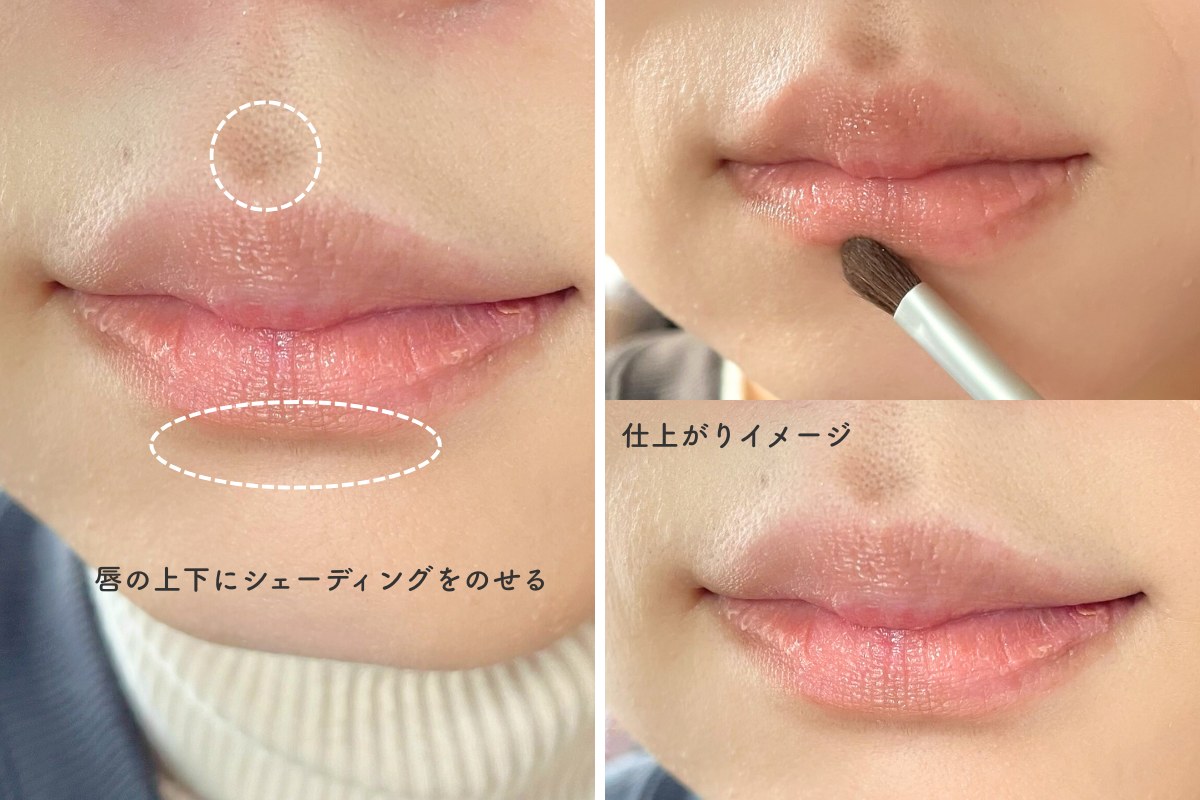 シェーディングで影を仕込むと、唇のボリューム感を強調できます。影を入れる位置は、上唇の上の凹み(人中部分)と下唇の下。細めのブラシでふんわりとのせると、作り込みすぎない自然な仕上がりに。