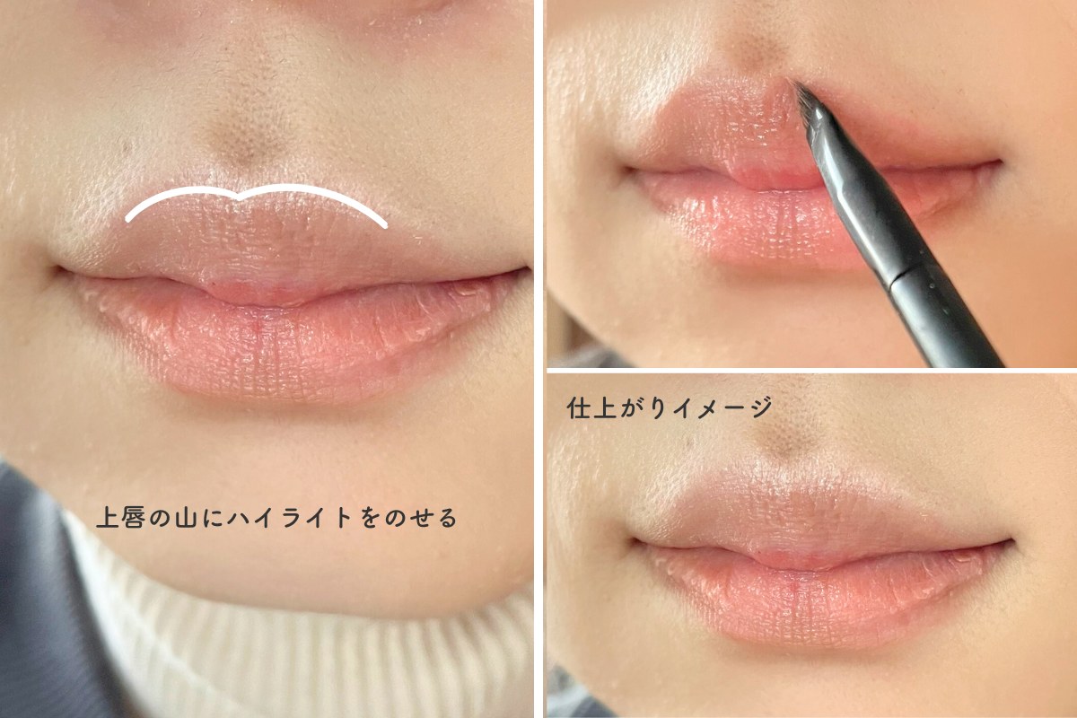唇の山をなぞるようにハイライトをのせることで、光を集めてより立体感がアップ。自然に仕上げるには、範囲を広げ過ぎないよう細めのブラシやチップを使うのがポイントです。