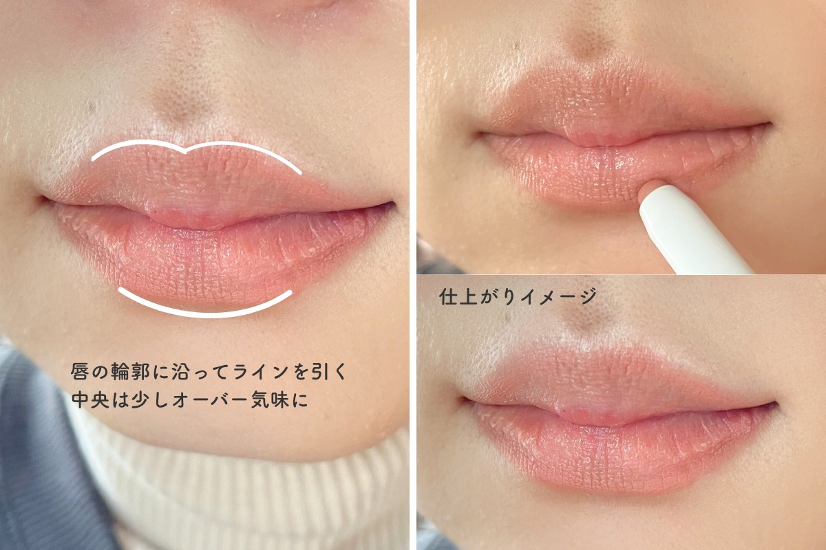 輪郭に沿ってラインを引きます。自然なボリューム感を演出するには、唇の中央のみオーバー気味に描くのがコツ。上唇の山を強調しすぎず丸みを持たせると、やわらかい印象に仕上がります。