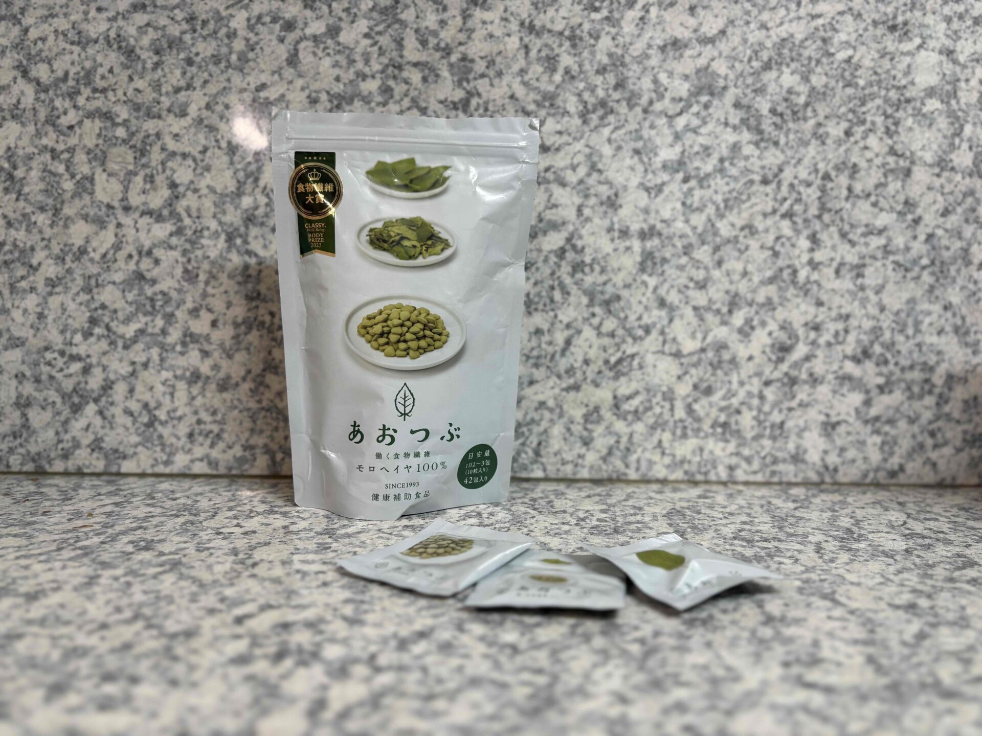 そこで手に取ったのが 「あおつぶ」。モロヘイヤ100%のシンプルな成分で、体に不要な添加物が入っていないのが魅力です。大きなメリットは手軽に食物繊維を補給できること。いつもの食事にプラスするだけで、便通がスムーズになり、お腹まわりの不快感が軽くなった実感があります。