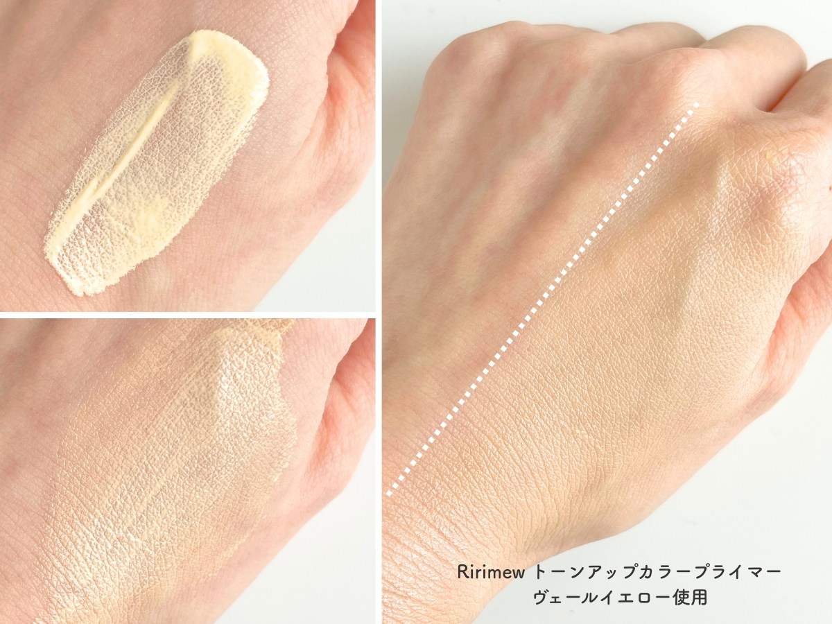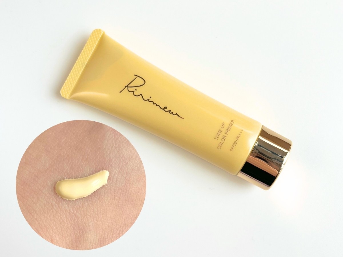 Ririmewのイエロー下地は、手に出したときはしっかりとした黄みを感じるカラー。ただ、肌なじみを高めるカプセルが配合されているため、伸ばすほど肌の色と調和。黄色の補正効果でトーンを整えながらも、明るさが浮きすぎず、ナチュラルに仕上がる点が魅力です。顔全体にはもちろん、クマやくすみが気になる部分へのポイント使いもおすすめ。