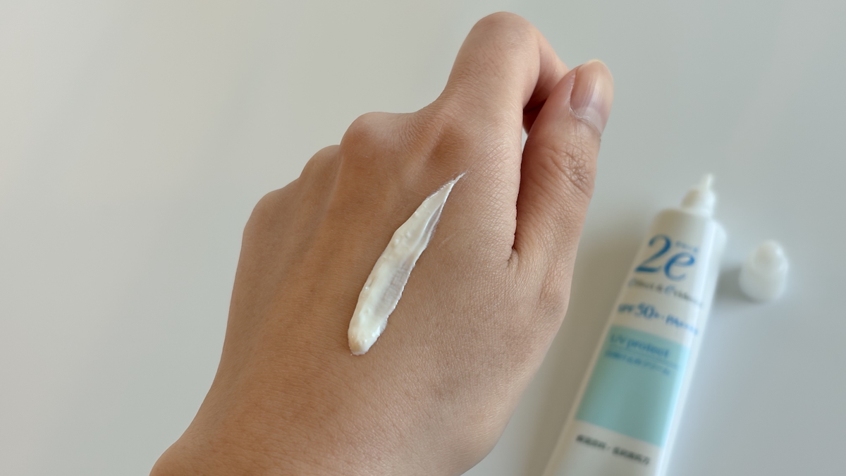 ライトベージュの色は、伸ばすと自然になじみます。スキンケアクリームのような軽やかさで、化粧下地として使用可能。洗顔料で落とせます。無香料・アルコールフリーで、赤ちゃんにも使えるやさしい処方です。